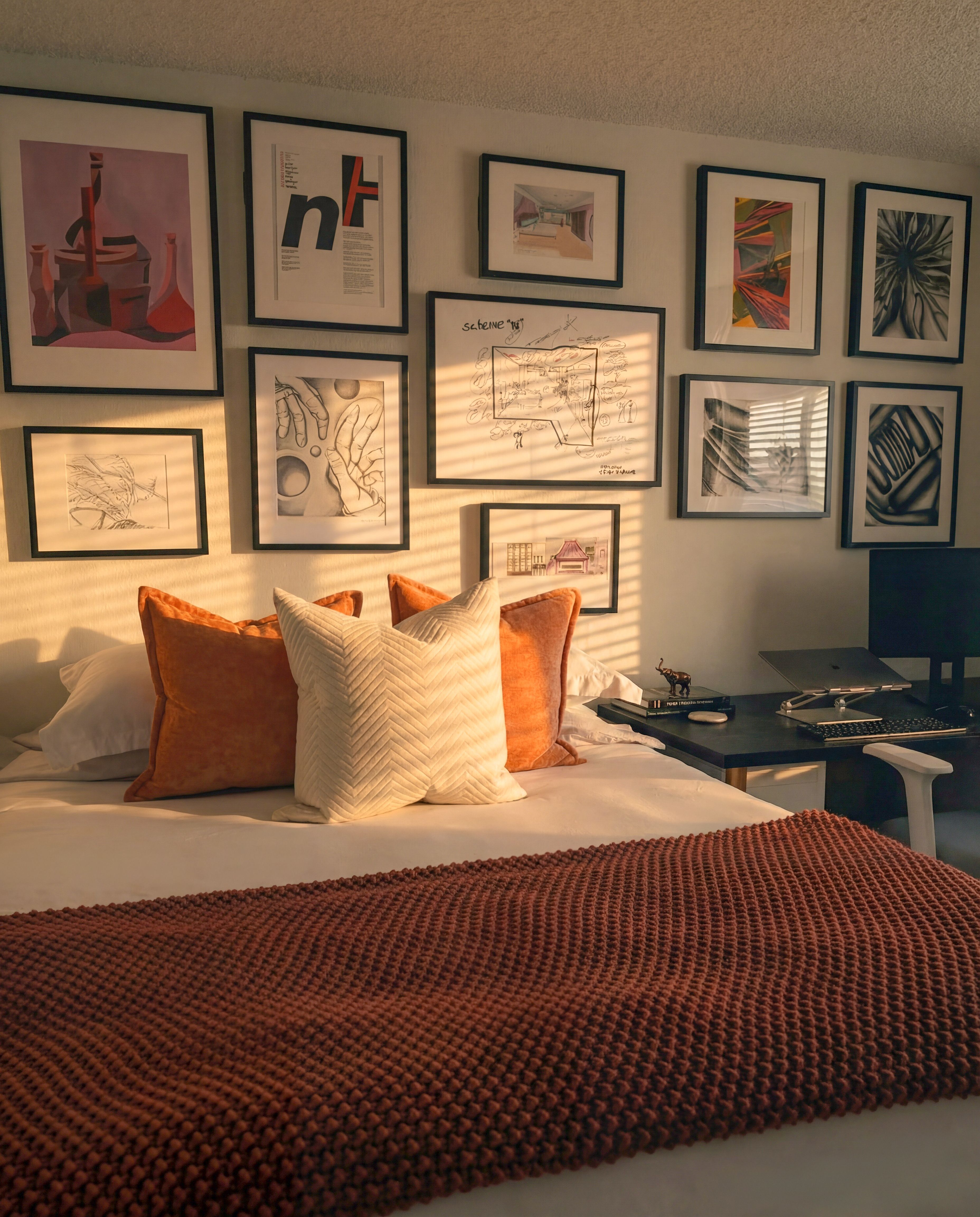 One of the biggest shifts came when I finally hung my art — pieces that had been sitting in my closet for over fifteen years. I made them the focal point of the room. Seeing my work on the wall changed how the space felt.